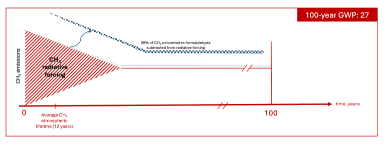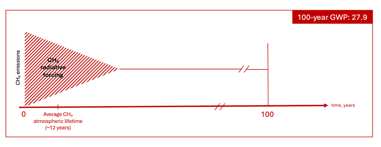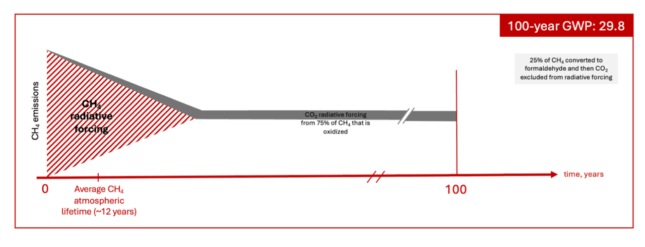 造成甲烷有三种不同GWP数据的直接原因就是甲烷的寿命较短。一般认为甲烷的寿命约12年,在寿命结束之后绝大多数(IPCC假定为75%)甲烷会通过大气化学作用转化为二氧化碳,而通常使用的GWP的时间尺度通常用100年。甲烷转化为二氧化碳仍然是温室气体。处理剩余88年的辐射强迫的不同方式,就导致了甲烷出现3种不同的GWP数值。